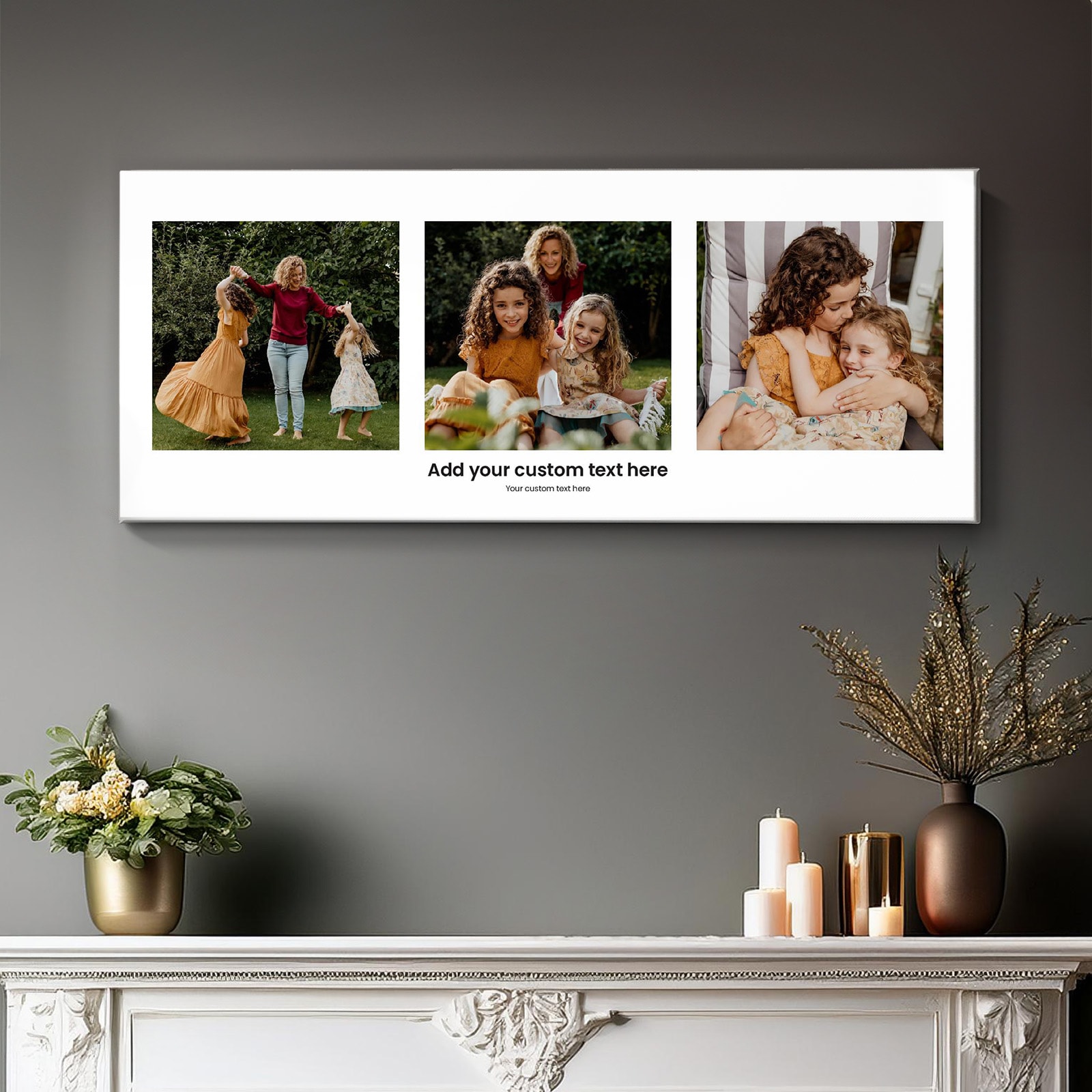 Also available as aframed or unframed print on this link. 3 Photo Read more… Panoramic Custom Canvas Collage with Personalized Text Turn your favorite memories into a striking piece of wall art with our 3 Photo Panoramic Custom Canvas Collage with Personalized Text. Designed and made in the USA, this premium panoramic canvas lets you combine three of your most meaningful photos with your own custom message to create a one-of-a-kind keepsake that celebrates life’s special moments. Whether you’re looking for a thoughtful gift or a unique addition to your own home décor, this custom panoramic canvas collage adds warmth, color, and personality to any space. Create Your Own Personalized Panoramic Canvas Collage Designing your own photo collage has never been easier. Simply upload three of your favorite photos — from weddings, vacations, family portraits, or everyday adventures — and add your personalized text such as a name, date, or favorite quote. With our real-time online preview technology, you can see exactly how your finished canvas will look before you buy. Every image is printed using professional-grade inks on premium artist canvas to deliver exceptional clarity, vibrant colors, and long-lasting quality that won’t fade over time. The panoramic layout is perfect for displaying a photo series or telling a visual story across one seamless, beautifully balanced canvas. Exceptional Quality – Made in the USA Each of our custom panoramic photo canvas collages is proudly made in the USA using only the finest materials. Your photos are printed on heavyweight, gallery-quality canvas and hand-stretched over a solid wood frame for a flawless, professional finish. We take pride in precision craftsmanship — every detail, from alignment to color accuracy, is carefully checked to ensure your personalized wall art looks stunning in any room. Available in medium and large sizes, your panoramic collage can make a subtle addition or a bold statement centerpiece. The Perfect Gift for Any Occasion Looking for a personalized photo gift that truly stands out? This panoramic 3-photo collage is a meaningful, heartfelt choice for any occasion: Anniversaries – Celebrate your journey together in pictures. Birthdays – Turn special memories into a lasting keepsake. Weddings – Capture the magic of the day in elegant panoramic form. Housewarming gifts – Bring character and warmth to a new home. Graduations or retirements – Commemorate milestones with photos that tell a story. Every personalized photo canvas collage is more than just a gift — it’s a piece of art filled with emotion, connection, and cherished memories. Fast, Free Shipping Nationwide We’re committed to exceptional quality and outstanding service. That’s why every order includes fast, free shipping anywhere in the U.S., with most custom canvases produced and shipped within five business days. Your canvas will arrive carefully packaged and ready to hang straight out of the box. Create Your Personalized Canvas Today Bring your memories to life with a custom panoramic photo canvas collage that combines your favorite pictures and personalized text in a clean, modern layout. Handcrafted in the USA and printed on premium materials, this panoramic canvas is the perfect way to showcase the moments that mean the most. Design yours today, preview it instantly online, and enjoy fast, free delivery across the United States. Whether as a thoughtful gift or a statement piece for your home, this custom canvas collage will be a beautiful reminder of the memories you treasure most.