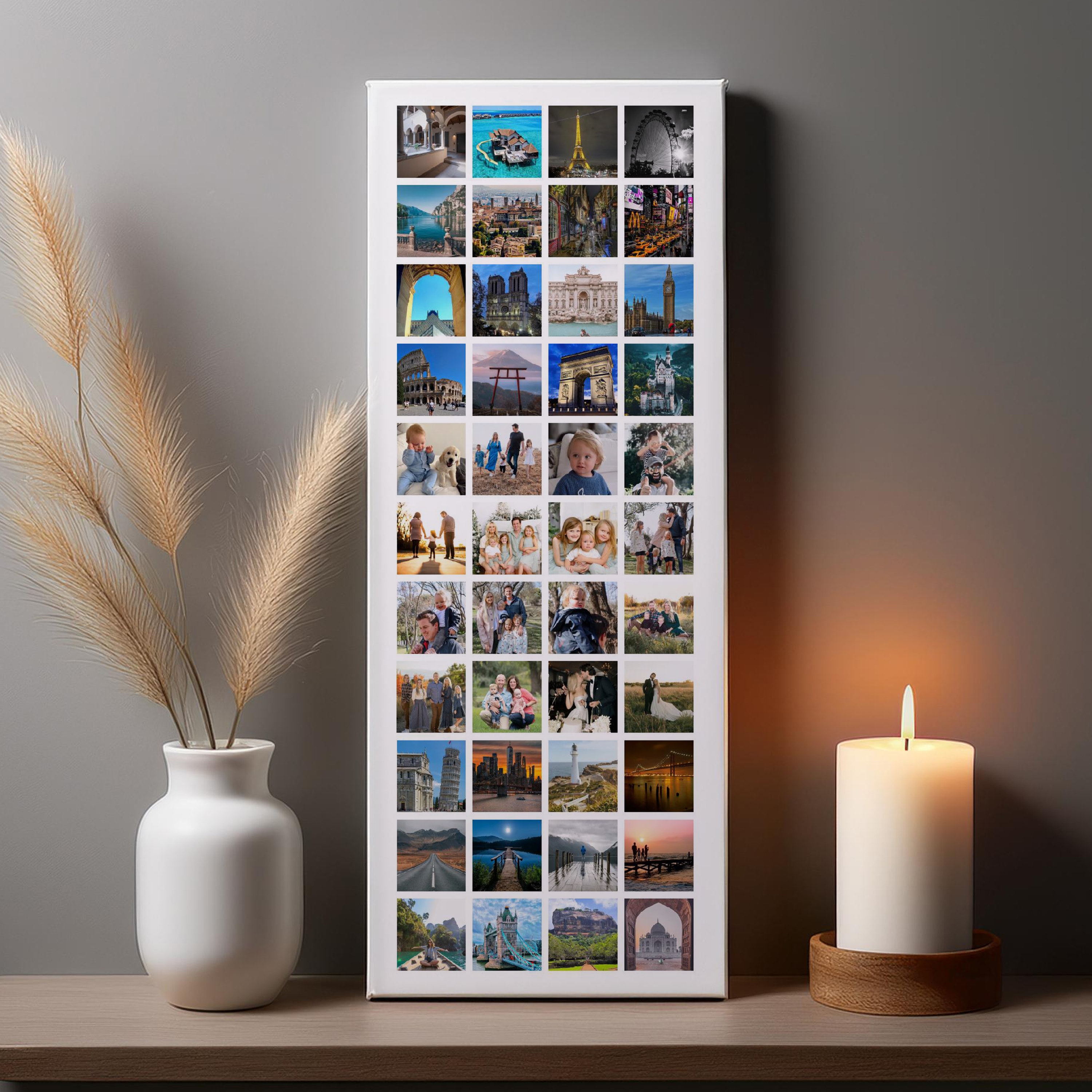 Also available as a framed or unframed print on this link.44-Photo Read more… Panoramic Custom Canvas Collage – Made in the USA Capture a lifetime of memories with our 44 photo panoramic custom photo canvas collage, proudly made in the USA. Designed to display your favorite moments in a wide, striking layout, this canvas transforms dozens of special photos into one breathtaking piece of wall art. Whether it’s a heartfelt gift or a stunning centerpiece for your home, this panoramic canvas celebrates the stories that matter most. Showcase Every Memory in One Beautiful Canvas Our 44-photo panoramic collage is the ultimate way to bring your photos together in a clean, contemporary design. With space for 44 of your favorite pictures, you can highlight birthdays, vacations, weddings, family portraits, and all the little moments in between — all in one seamless display. Each image is arranged in a balanced panoramic layout, creating a professional, gallery-quality finish that fits perfectly across any wall. Choose to include personalized text such as a family name, quote, or special date to make your canvas truly one-of-a-kind. Premium Quality – Handcrafted in the USA Every panoramic canvas collage is handcrafted in the USA using the highest-quality materials and printing technology. Your photos are printed with fade-resistant inks on premium artist-grade canvas, producing rich colors, sharp details, and a finish that will last for years. Our skilled production team hand-stretches each print over a solid wood frame, ensuring a smooth surface with no warping or sagging. The result is a durable, professional-quality piece of wall art that’s ready to hang the moment it arrives. Choose from multiple size options to fit your wall space — whether you want a bold statement piece or a subtle yet stunning display. Easy to Create – See Your Design Before You Buy Designing your custom panoramic photo canvas couldn’t be easier. Our user-friendly online tool lets you upload your 44 photos directly from your phone, tablet, or computer. You can then arrange them effortlessly using our live on-screen preview, so you’ll see exactly how your finished collage will look before you place your order. Adjust, reposition, and fine-tune every detail until it’s perfect — no design experience needed. Our intuitive interface makes the creative process fast, fun, and frustration-free. The Perfect Personalized Gift A 44-photo panoramic canvas collage makes a thoughtful and emotional gift for any occasion. Celebrate a wedding anniversary, milestone birthday, graduation, retirement, or family reunion with a gift that truly tells a story. Because it’s custom-made and handcrafted in the USA, it’s not just another print — it’s a piece of art filled with memories, love, and meaning. Fast, Free Shipping Across the USA Once your design is complete, we’ll carefully craft and ship your custom photo canvas within two business days, with fast, free delivery anywhere in the USA. Every canvas is securely packaged to ensure it arrives in perfect condition, ready to hang and admire. Whether you’re gifting it or displaying it in your own home, your panoramic collage will be a lasting reminder of the moments that matter most.