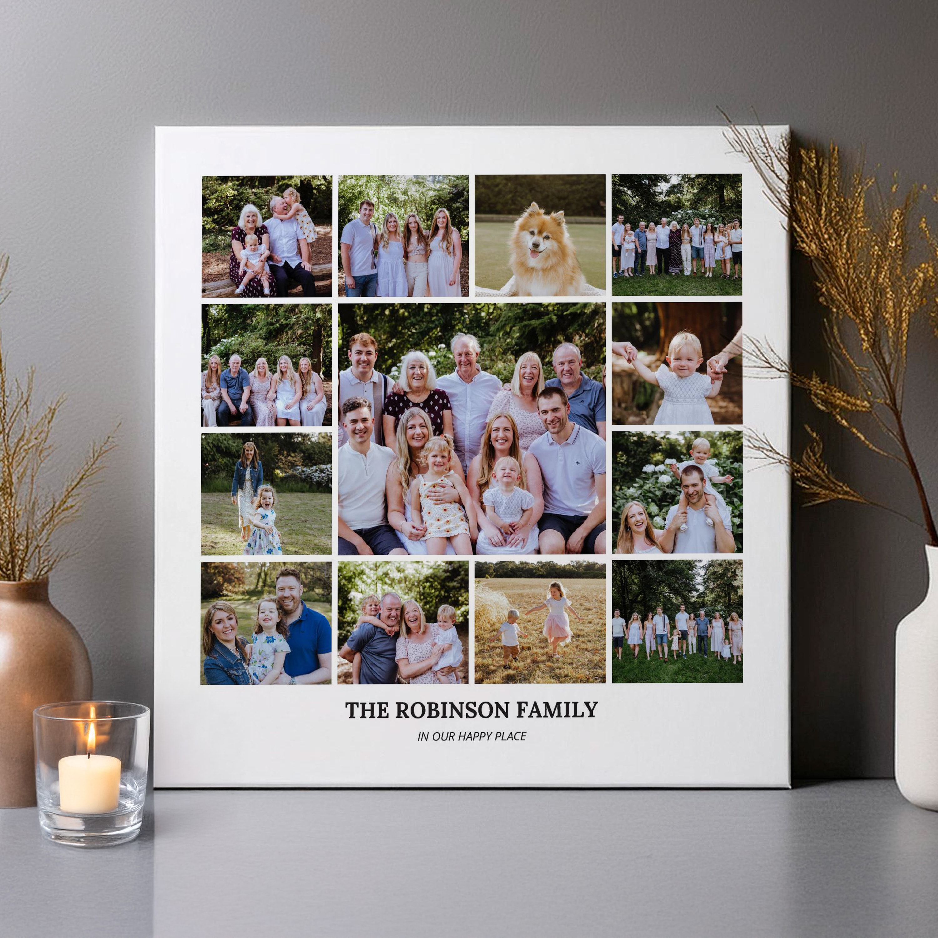 This custom photo collage is also available as a framed or Read more… unframed print on this link. Transform your favorite memories into a stunning piece of wall art with our custom photo canvas collage with personalized text. This beautiful design allows you to showcase your most cherished moments in a high-quality photo collage, printed on premium canvas and finished with your own heartfelt message. Perfect for birthdays, anniversaries, weddings, or simply celebrating life’s everyday moments, this personalised photo canvas is a thoughtful gift that blends creativity, emotion, and style. Create Your Own Personalized Photo Canvas Collage Our easy-to-use online tool makes designing your photo collage effortless. Simply upload your photos, choose your layout, and add your personalized text — such as names, dates, or a meaningful quote. You’ll see your design come to life instantly on screen before ordering, thanks to our live preview technology. Each custom canvas is printed to perfection using premium inks that deliver sharp details and rich, vibrant colours. Whether you want to showcase wedding photos, family holidays, or a lifetime of memories, your images will look incredible on our gallery-quality canvas material. Premium Quality – Made in the USA Every personalised canvas collage is handmade in the USA to the highest standards. We use heavyweight, 100% cotton canvas stretched over a solid wooden frame for a sleek, professional finish. The result is a durable, long-lasting piece of art that looks as good as it feels. Our attention to detail ensures your photos are perfectly aligned, colours are true to life, and your personalised text is beautifully presented. Choose from a variety of sizes to suit your space — whether you want a compact design for your home office or a large statement piece for your living room. A Thoughtful Gift for Any Occasion This custom photo canvas collage makes a wonderful, heartfelt gift for family and friends. It’s ideal for: Anniversaries – Celebrate your love story in pictures. Birthdays – Create a unique and personal keepsake. Weddings – Capture the joy of the big day. New Homes – Add warmth and character to any room. Mother’s or Father’s Day – A beautiful reminder of family moments. Each canvas is filled with emotion and meaning — a gift that will be treasured for years to come. Fast, Free Shipping We believe in exceptional service as well as exceptional quality. That’s why we offer fast, free US delivery, with most custom canvas collages dispatched within 2-3 working days. Your artwork arrives securely packaged and ready to hang, so you can enjoy it straight away. Create Your Custom Canvas Today Bring your memories to life with a personalized photo canvas collage that tells your story beautifully. Designed, printed, and handcrafted in the UK, it’s the perfect way to celebrate life’s moments — and the people who make them special. Upload your photos, add your message, and preview your design today. With our premium quality and free fast delivery, you’ll soon have a one-of-a-kind canvas that captures the heart of your memories.