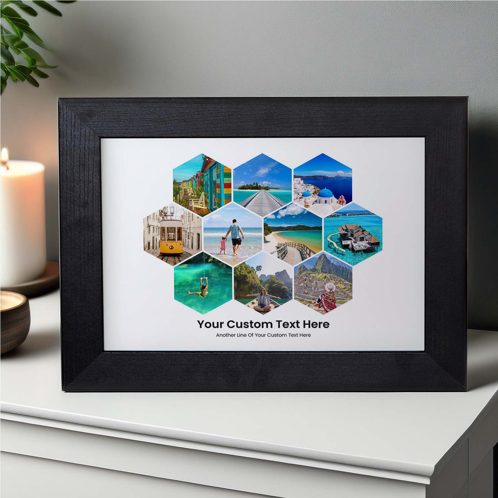 Custom Hexagonal Photo Collage Print with Personalized Text – A Modern Gift Full of Memories Celebrate your favourite moments in style with our Custom Hexagonal Read more… Photo Collage Print, featuring 10 of your photos in a sleek geometric design and two lines of personalized text to make it truly your own. This unique piece of wall art transforms your memories into a stunning, contemporary photo montage — the perfect balance of modern design and heartfelt emotion. Whether you’re looking for a thoughtful birthday gift, a romantic anniversary present, or a meaningful keepsake for your home, this custom print captures life’s most precious moments beautifully. Available as a framed print (in black or white), premium canvas, or unframed paper print, this landscape-format design makes a timeless statement in any room. With our live on-screen preview technology, you can see your custom creation before you buy — ensuring every detail is exactly how you imagined it. A Picture-Perfect Gift Designed from the Heart In a world of generic gifts, this personalized photo collage print stands out as something truly meaningful. Each of the ten hexagonal photos forms part of a striking, balanced composition — your story told through your favourite moments. Every snapshot, smile, and memory combines to create a visually stunning mosaic that’s both contemporary and deeply personal. Add two lines of text — perhaps a name and special date, a short message, or a meaningful quote — to give your design an extra emotional touch. This is more than wall art; it’s a gift full of love, laughter, and life. Whether you’re marking a milestone anniversary, celebrating family memories, or surprising a loved one “just because,” this photo collage brings emotion and artistry together in one perfect keepsake. High-Quality Craftsmanship for Lasting Beauty Every custom hexagonal photo print is crafted using the highest-quality materials and printing techniques to ensure your memories are preserved in vivid detail. We use professional-grade printers, archival-quality inks, and premium paper or canvas to produce a flawless finish that’s rich in color, crisp in detail, and made to last a lifetime. Choose your preferred format: Framed Prints (Black or White): Elegant, ready-to-hang options that give your collage a polished gallery look. Canvas Prints: Printed on thick, artist-grade canvas with fade-resistant inks for rich texture and durability. Unframed Prints: Perfect for those who prefer to choose their own frame or display style. Every print is produced by our expert UK team and quality-checked by hand, ensuring a professional finish every single time. Contemporary Design That Fits Any Space The hexagonal layout gives this design a stylish and contemporary edge, perfect for modern homes and offices alike. The geometric pattern creates a sense of flow and symmetry, making it visually striking while allowing each photo to shine individually. This landscape format works beautifully above a sofa, bed, or mantelpiece — or as part of a feature wall surrounded by your other favourite prints. With a choice of background colors, frame options, and sizes, your personalized photo print can be tailored perfectly to your space and style. Personalized Text for a Meaningful Touch Your story deserves to be told in your own words. That’s why this design includes two lines of custom text, placed beneath or alongside your hexagonal photo layout for balance and clarity. Use your text to: Add a name and special date (e.g., “Sarah & Tom – Est. 2015”) Include a meaningful quote or lyric Write a personal message such as “Forever in our hearts” or “Memories we’ll treasure forever” It’s the perfect way to add emotional depth and personal significance to your print — transforming it from a collage of images into a timeless story of love, family, or friendship. The Perfect Gift for Any Occasion Looking for something different to give? This custom photo picture print makes the ideal gift for so many occasions — because it’s not just about the design, it’s about the memories behind it. Perfect for:Anniversaries: Celebrate your journey together with photos and words of love. Birthdays: Surprise a loved one with a gift full of shared memories. Weddings: A beautiful way to commemorate the big day. Mother’s or Father’s Day: A heartfelt reminder of family moments. Graduations or New Homes: Capture new beginnings in style. Memorials: Honour a life beautifully remembered. Whatever the occasion, this one-of-a-kind print makes an unforgettable impression. It’s personal, emotional, and created with care. See Your Design Before You Buy – Live Preview Technology Creating your personalized print couldn’t be easier — and thanks to our live on-screen preview system, you’ll see exactly how your artwork looks before you order. In just a few clicks, you can: Upload your 10 favourite photos from your device. Add your two lines of custom text — perhaps a message, names, or a special date. Watch your unique collage appear instantly on screen.Adjust, preview, and perfect your design before checkout. There’s no need to guess what the finished product will look like. What you see is exactly what you’ll receive — a beautifully printed, high-quality design made with precision and love. Fast, Free UK Delivery – Ready in Just Two Working Days We know how important it is to receive your gift quickly, especially for last-minute occasions. That’s why we offer fast, free UK delivery on all orders, and we aim to ship within two working days. Your print is carefully packaged to arrive in perfect condition, ready to hang, display, or gift straight away. We take care of every detail — so you can relax knowing your thoughtful, personal gift is on its way. Why Customers Love Our Custom Prints With over 12,000 five-star reviews on Trustpilot, our customers trust us to deliver beautiful, meaningful, and pro