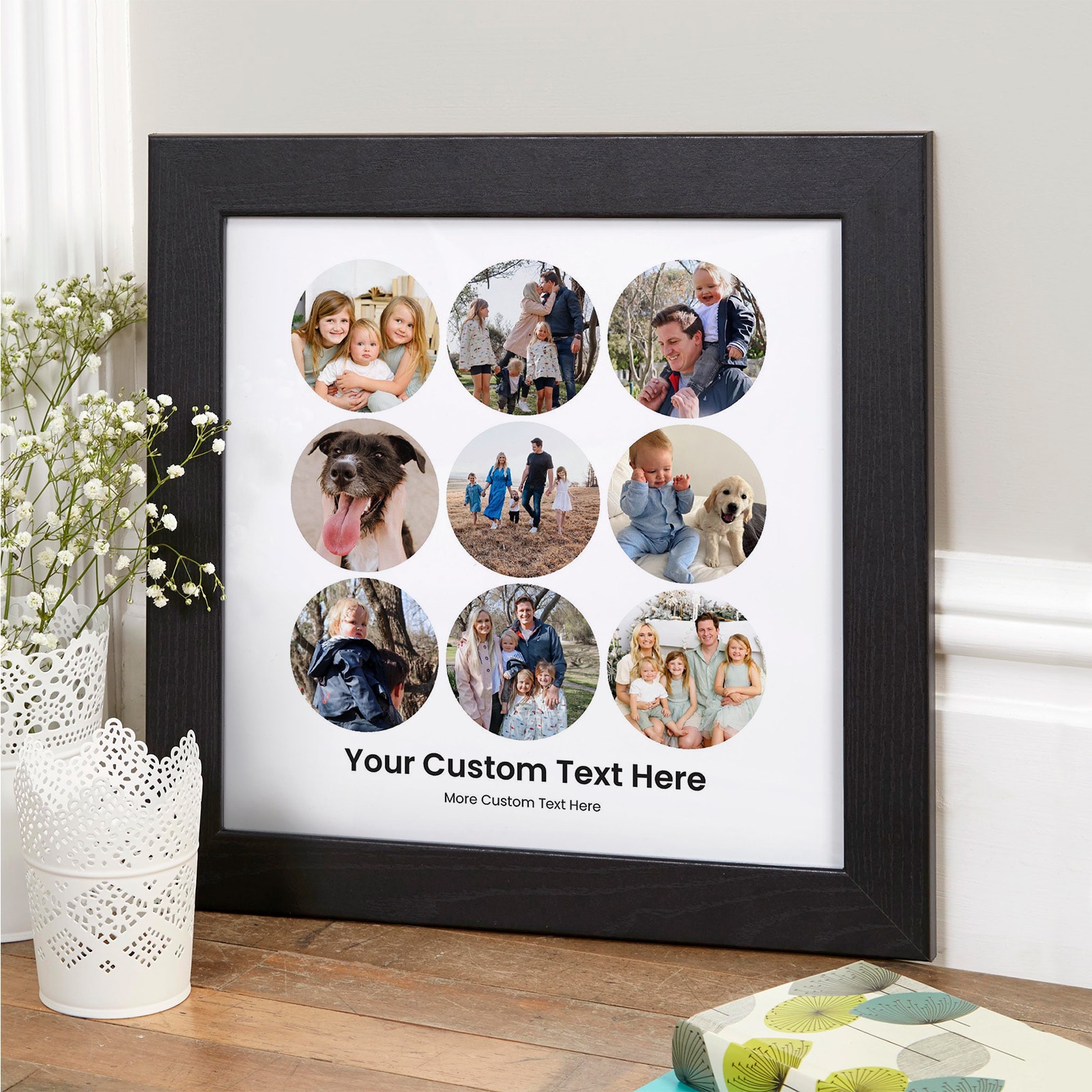 Capture your most meaningful moments in a stunning, contemporary design with our Custom 9 Photo Round Grid Print. Perfectly arranged in a modern square format, this beautiful Read more… photo montage brings your favourite pictures together in nine elegant circular frames — creating a timeless piece of personalized wall art that’s both stylish and sentimental. Whether you’re celebrating a birthday, anniversary, wedding, or milestone moment, this print transforms your treasured photos into a high-quality keepsake that will be admired for years to come. With two lines of personalized text below your photo grid, you can add names, dates, or heartfelt messages to make your creation truly one of a kind. Contemporary Design Meets Heartfelt Memories Our round photo collage print is designed for those who appreciate clean, modern design while cherishing the warmth of their personal memories. Each image is placed in a precisely aligned circular frame, creating a harmonious and visually striking layout. The circular design gives your photos a soft, timeless look that fits effortlessly into any home decor style — from modern minimalist to rustic chic. The square format makes it ideal for hanging in living rooms, bedrooms, hallways, or offices. It’s equally stunning displayed as part of a gallery wall or as a statement piece on its own. Your photos deserve to be seen and celebrated — and this print does exactly that. A Thoughtful Personalized Gift for Any Occasion Finding a truly meaningful gift can be a challenge. That’s why this custom round photo collage print makes such a heartfelt choice. It’s personal, creative, and filled with memories that matter most. Here are just a few occasions where this gift truly shines: Anniversaries: Relive your favourite memories together, from your first date to your wedding day. Birthdays: Celebrate a loved one’s special day with a collection of their happiest moments. Weddings & Engagements: Capture the love and laughter of the big day in a beautiful keepsake. Family Gifts: Bring generations together in one design — perfect for parents or grandparents. New Home Gifts: Add warmth and personality to a new space with cherished photo memories. Friendship or Travel Gifts: Celebrate adventures, laughter, and shared experiences with a collage that tells your story. It’s not just a print — it’s a reflection of life’s most precious memories. Your Personal Touch – Custom Text Options Make your print uniquely yours with two lines of personalized text beneath your photo collage. Add a name, a date, a quote, or a heartfelt message that captures the emotion behind your photos. Whether it’s “Our Best Moments Together”or “Family – Where Life Begins and Love Never Ends”, your words will make the design even more meaningful. Each detail is carefully placed to complement your photos and ensure your text looks perfectly balanced within the layout. Premium Quality You Can See and Feel We pride ourselves on delivering exceptional quality in every print. Each piece is produced using professional-grade printing technology and archival-quality inks to ensure crisp details, vibrant colors, and long-lasting results. You can choose from three stunning finishes to suit your space and style: Framed Prints: Available in sleek black or white wooden frames, ready to hang. Canvas Prints: Professionally stretched onto solid wooden frames for a bold, textured finish. Unframed Paper Prints: Ideal for those who prefer to frame their art themselves or gift it rolled in tissue. Each option is made to order in the UK, ensuring high craftsmanship and attention to detail from start to finish. See Your Design Come to Life Instantly Our exclusive live preview technology lets you see your custom photo design on screen as you create it. Simply upload your nine photos, add your personalized text, and instantly view exactly how your finished print will look before you buy. No guesswork, no surprises — just the perfect design, exactly how you imagined it. This unique feature ensures total confidence in your purchase and makes the creation process quick, fun, and easy. Fast Free Delivery – Made in the UK We understand that when you’ve created the perfect personalized gift, you want it quickly. That’s why we offer fast, free UK delivery on all orders. Our dedicated team aims to dispatch every order within two working days, ensuring your custom wall art arrives beautifully printed, perfectly packed, and ready to display or gift. Why Customers Love Our Custom Photo Prints We’ve proudly earned thousands of 5-star reviews from happy customers who love their personalized wall art. Here’s why: Exceptional Quality: Every print is professionally produced to the highest standards. Fast & Reliable Delivery: Free UK delivery with 2-day dispatch. Easy to Create: Simple photo uploads and instant previews make designing effortless. Genuine Personalisation: Add names, dates, and messages to make it truly special. Made with Care: Each order is individually crafted in our UK studio. Our passion for quality and customer satisfaction shines through in every print we make. Celebrate Life’s Moments with Style and Emotion This 9 photo round collage print isn’t just decoration — it’s a heartfelt celebration of life, love, and connection. It captures the laughter of family holidays, the warmth of friendships, and the love shared between couples. Every glance at your print brings those moments flooding back — reminding you why they matter and how beautiful those memories truly are. Whether given as a gift or displayed in your own home, it’s a daily reminder of the people and experiences that make life so special. How to Create Your Custom Round Photo Collage PrintChoose Your Format: Select from framed, canvas, or unframed prints in medium or large sizes. Upload Your Photos: Pick nine of your favourite images — from family portraits to travel snaps. Add Your Text: Includ